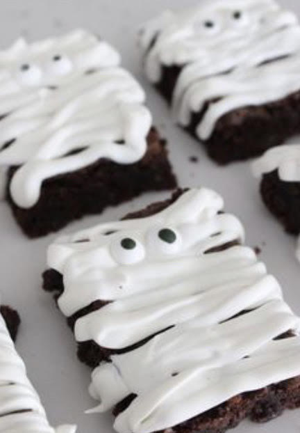 The first thing that I chose to make was mummy brownies. This yummy treat was so easy to make and required very few ingredients- a true DIY! I started out by purchasing a box of generic brownie mix from the grocery store along with eggs, fudge frosting and white frosting. One of the nice things about this DIY is that you can take it in many directions, as long as you keep the mummy design apparent. For example, you can make it in the form of a brownie, cake, cupcake or even cookies! This makes the treat very versatile and fun because there is so much you can do with it! After making your baked good of choice, you are going to want to let it cool for at least a half hour so it doesn’t melt the frosting. After this period, take your white frosting and move it in a left to right motion while going down the brownie to achieve that mummy look! After you’ve frosted the treat to your liking, you can frost on eyes or put fake eye decorations on top to get a more realistic feel.